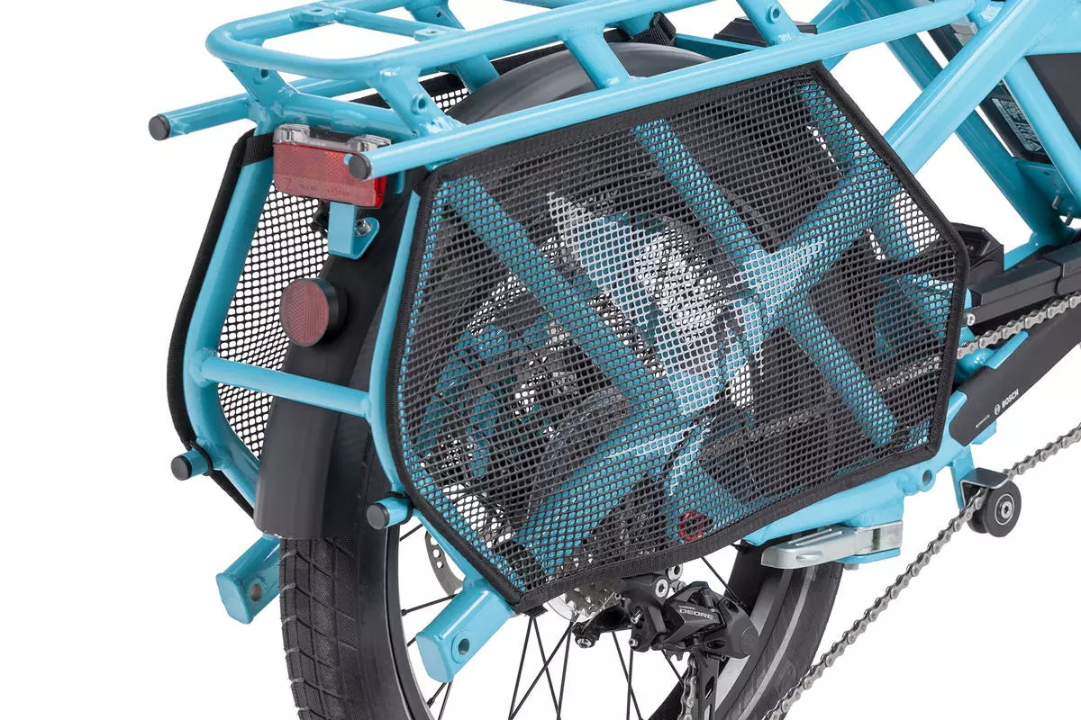 Der Tern Foot Guard ist schnell und einfach montiert und ist aus einem flexiblen Netzgewebe hergestellt. Der FuĂschutz wird anstatt der groĂen AuĂentaschen am Hinterrad befestigt.