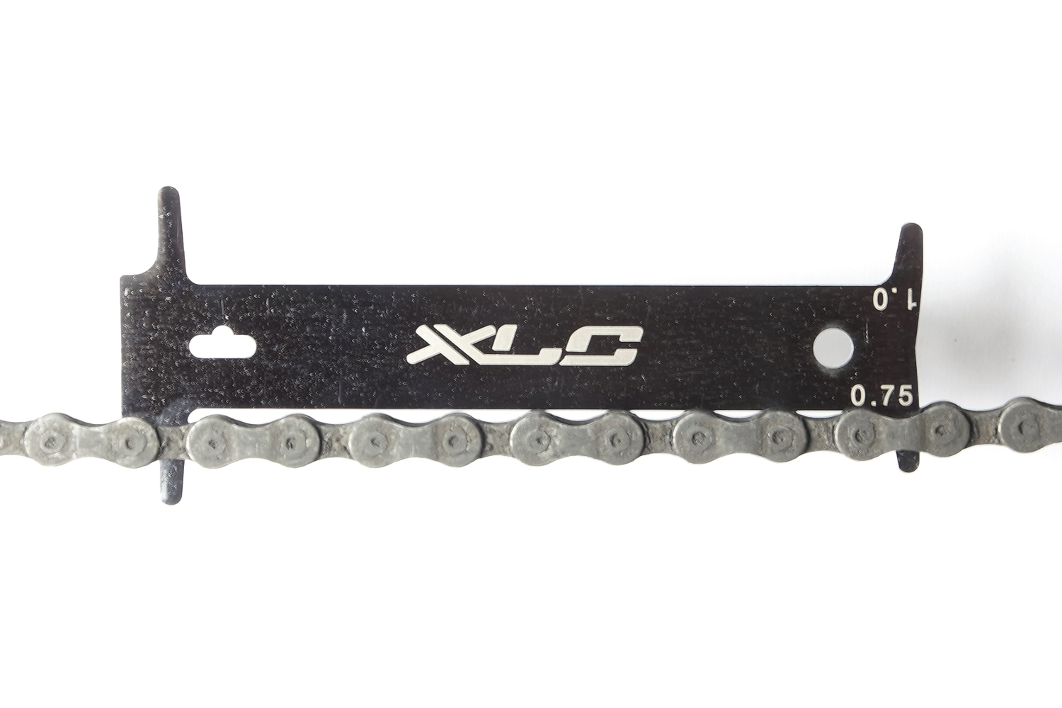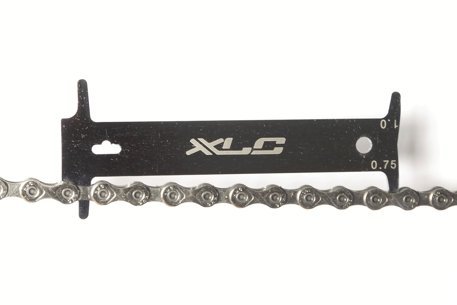 - Mit der XLC Kettenverschleiß-Lehre lässt sich eine Längung von 0,75 (noch gut) und 1 % (Kettenwechsel sinnvoll) feststellen.
